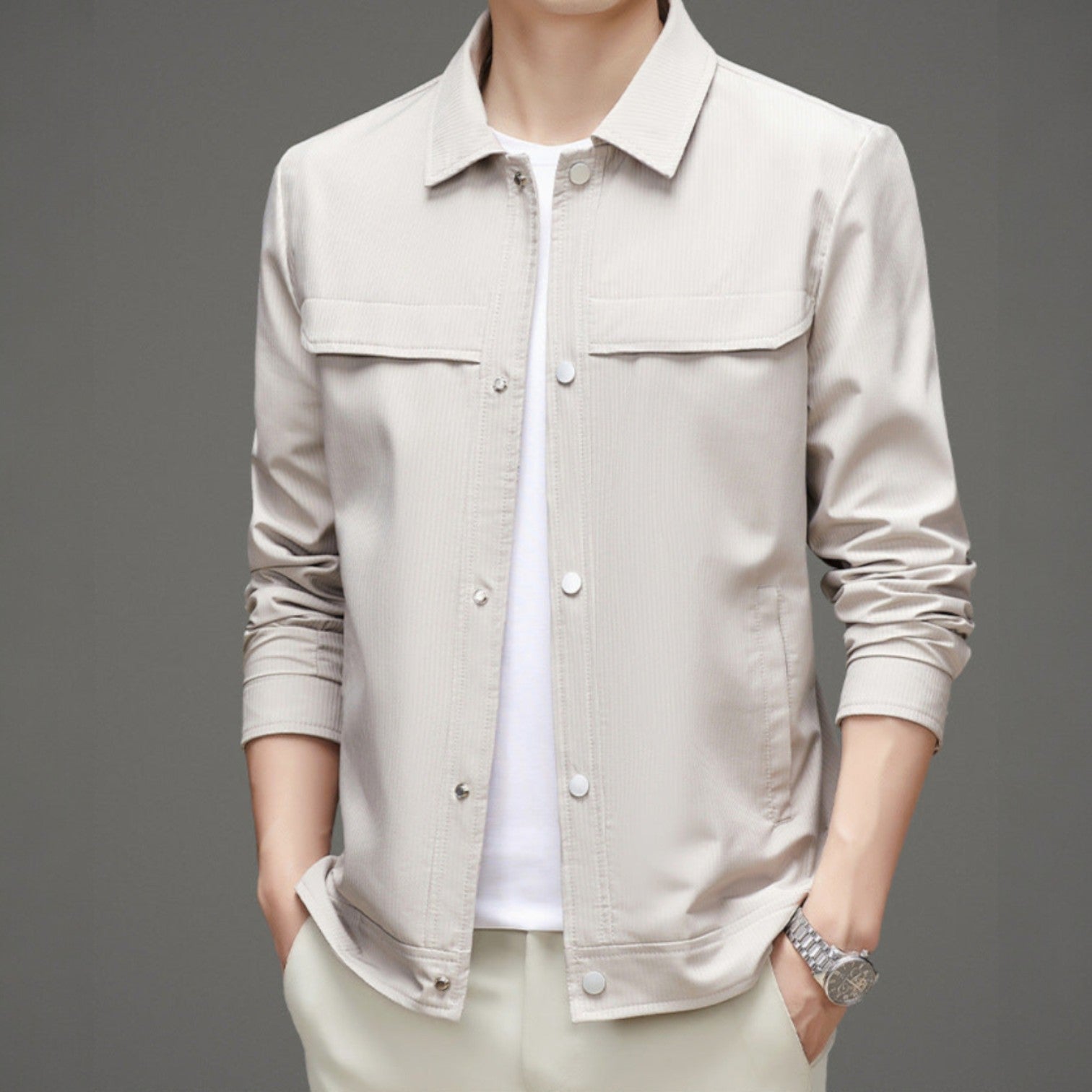 Lightweight in feel and defined by a minimal vertical-lined texture, this jacket delivers a clean design with a sharp collar and structured finish, adding finesse to casual wear.