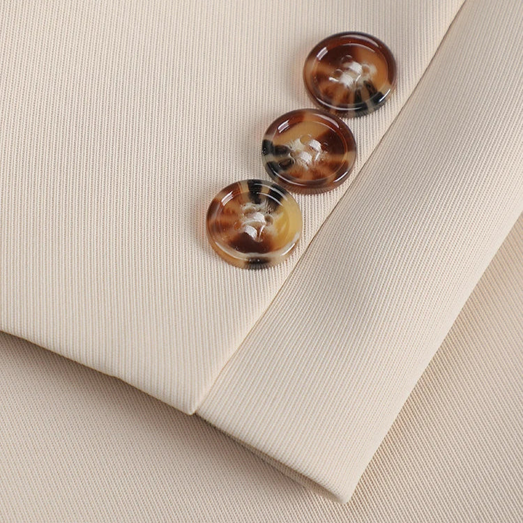 Tailored in a refined silhouette, this blazer carries a smooth, creamy texture that drapes cleanly. Tortoiseshell-style buttons and notched lapels lend classic polish, while the lined interior ensures comfortable layering.