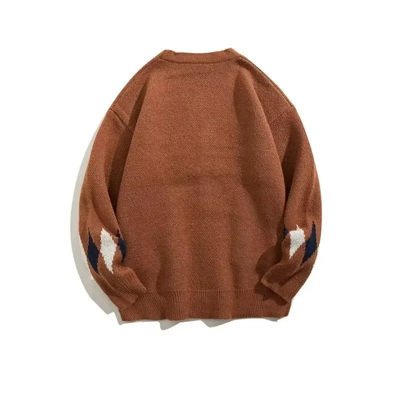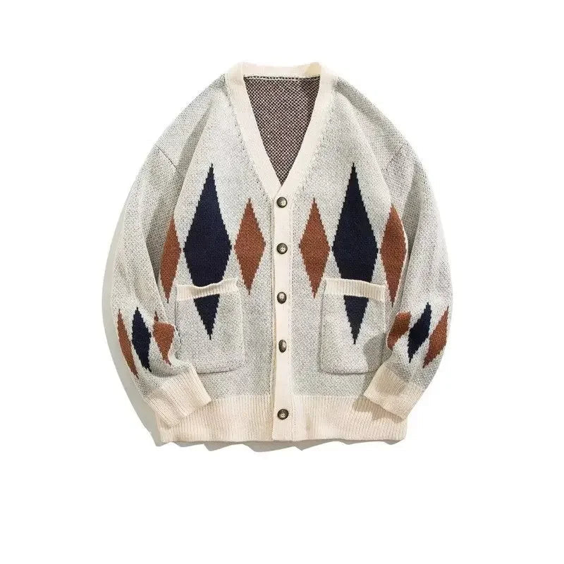 Knitted in a soft, mid-weight weave, this cardigan is defined by an oversized argyle pattern across the body and vintage-inspired sleeves. Its dropped shoulders lend a relaxed fit, making it ideal for laid-back mornings or smart-casual outings.